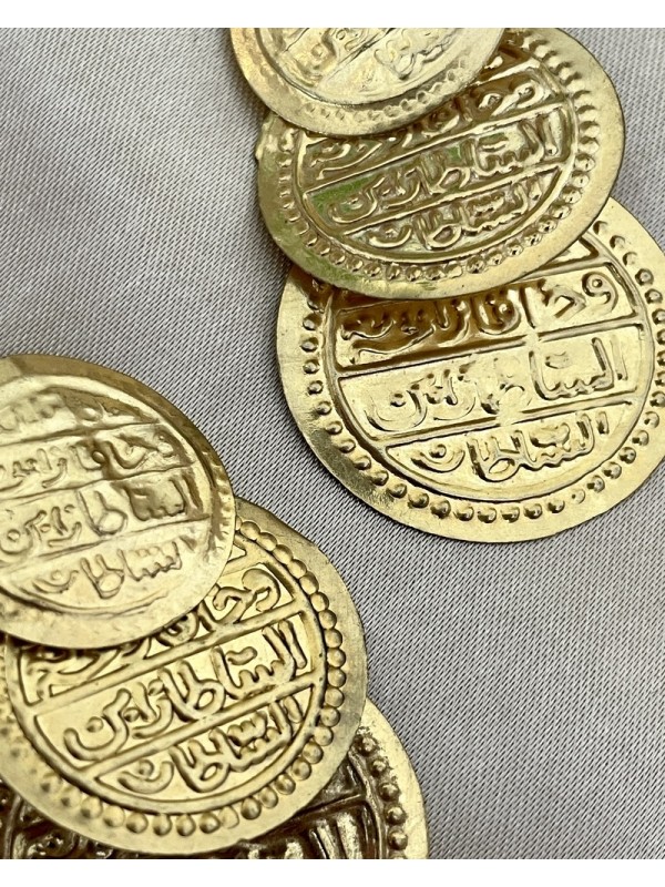 Boucles d’oreilles Mahboub en cuivre doré martelé, ornées de médailles gravées d’inspiration orientale
