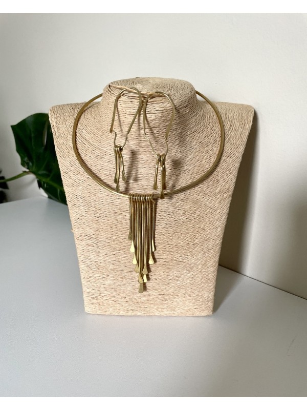 Parure boucles d’oreilles et collier ras-du-cou – style ethnique Collier rigide épousant le cou, orné d’un pendentif vertical aux fines tiges de longueurs variées, terminées par de petites gouttes aplaties créant un effet frangé