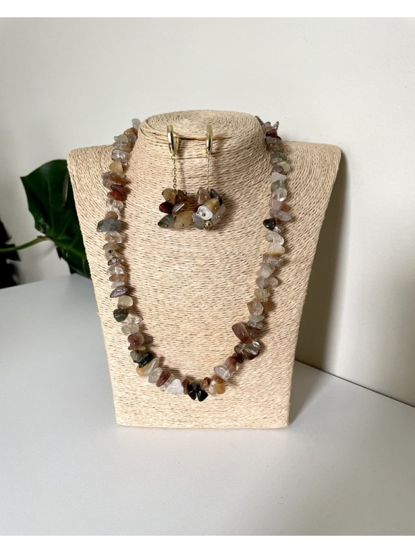 Parure pierre chips composée d’un collier et de boucles d’oreilles assorties, réalisées à partir de pierres naturelles aux nuances de beige, gris, brun et vert. Les tailles irrégulières offrent un rendu organique et authentique