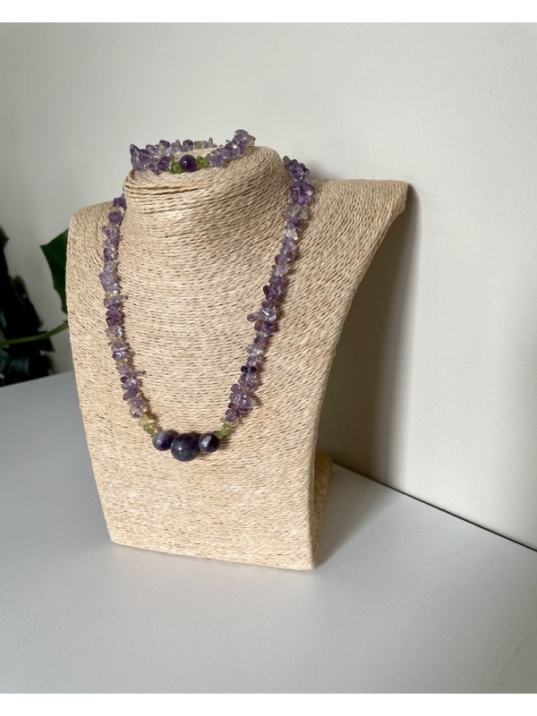 Parure améthyste chips composée d’un collier et d’un bracelet, aux nuances de violet clair à profond. Une création chic et spirituelle