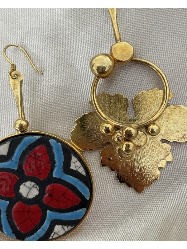 Boucles d’oreilles dépareillées en argent plaqué or, motif feuille de raisin doré et design en céramique.