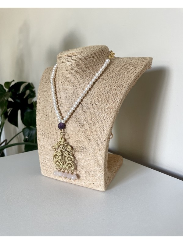 Collier Perles de Culture , améthyste violette centrale et pendentif filigrane doré orné de pampilles claires