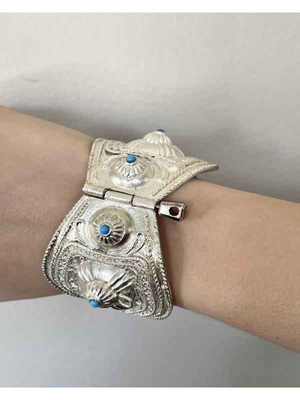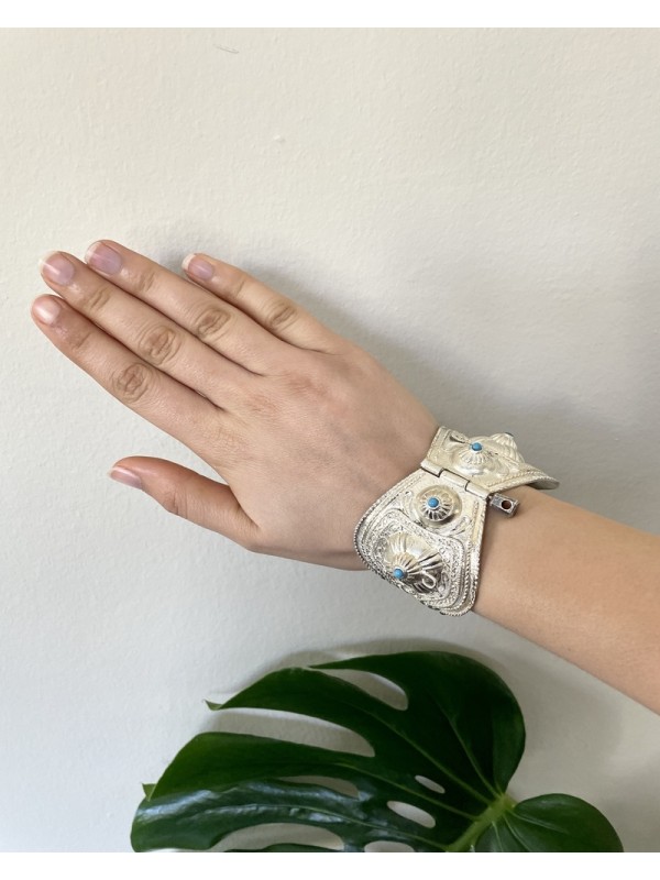 Large manchette rigide argentée, à la forme structurée et volumineuse, ornée de reliefs coquille et de motifs amazigh ciselés. De petites perles turquoise sont incrustées au centre