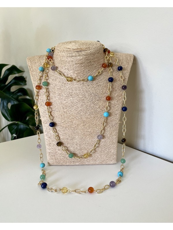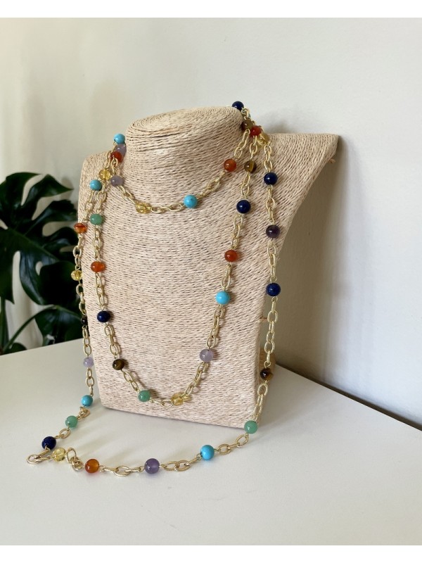 Sautoir en chaîne inoxydable, orné de perles multicolores des sept chakras, longueur 162 cm