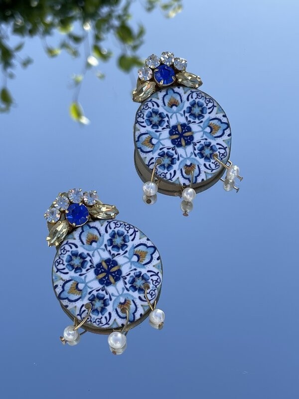 Boucles d'oreilles rondes imprimées avec des cristaux et perles de cultures