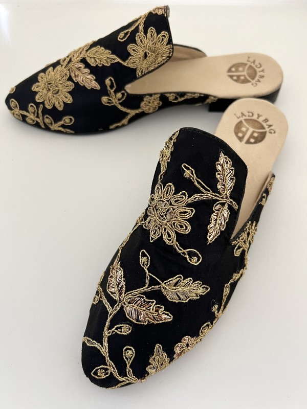 Mules en tissu avec broderie dorée grands motifs floraux intérieur 100% cui