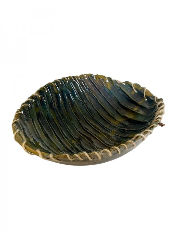 Bol artisanal en raku, aux stries texturées et émaillage bleu-vert profond, souligné par un bord travaillé avec corde naturelle. Une pièce unique d’inspiration organique, évoquant une carapace