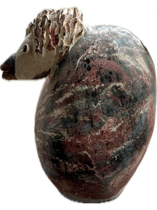Canard GM en raku technique borax orné de longues plumes métalliques La sculpture allie la texture douce du raku avec la brillance des plumes en métal, créant un effet magique et féerique