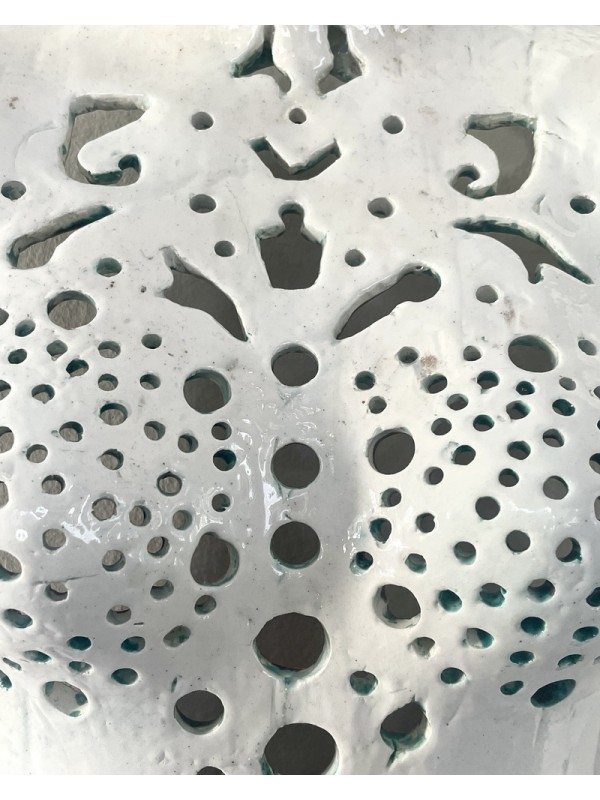 Sculpture buste en céramique raku, émaillé blanc, travaillée en ajouré et perforations décoratives. Une pièce artistique féminine, raffinée, à suspendre ou à poser, créant de beaux jeux d’ombres avec la lumière