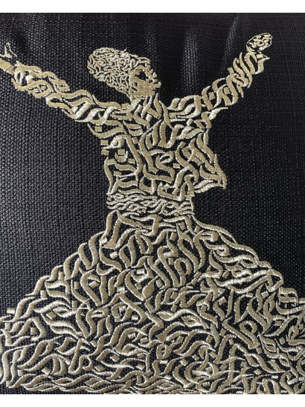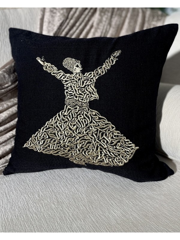 Coussin noir à calligraphie brodée dorée, motif darouich  tournant