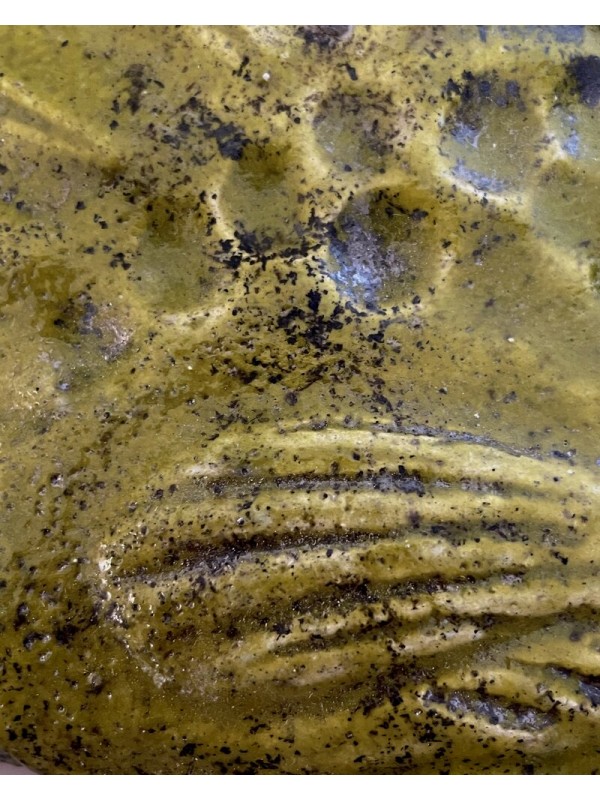 Poisson en raku, délicatement façonné, arbore des nuances de vert, d'orange et de fines lignes noires qui accentuent ses courbes , Ses nageoires et ses  écailles  d'un réalisme saisissant, sont mises en valeur par des fissures naturelles qui ajoutent une texture unique