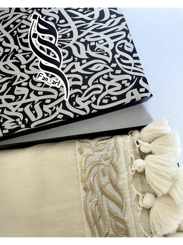 Une écharpe beige Hayek, ornée de pompons et de calligraphie brodée