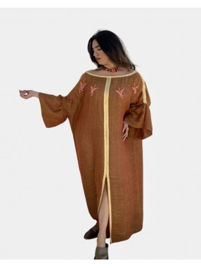 Jebba en tissu Hayek, dotée d’un col bateau et de manches à volants, ornée de galons dorés et décorée de motifs Khlel réalisés au crochet