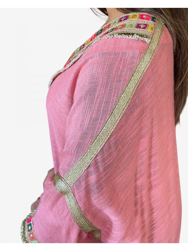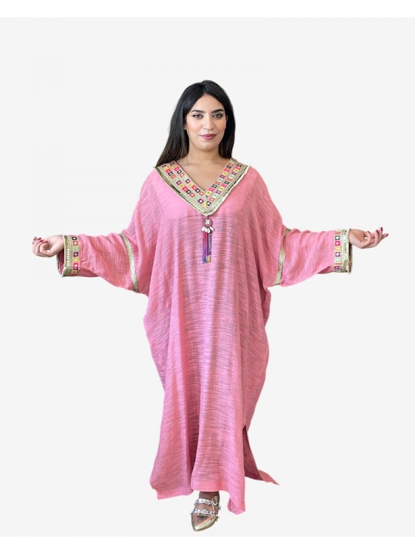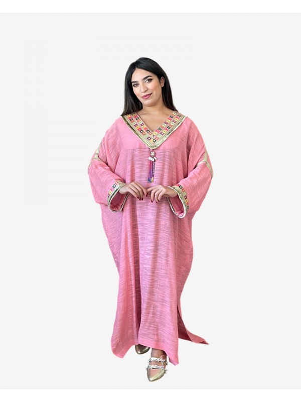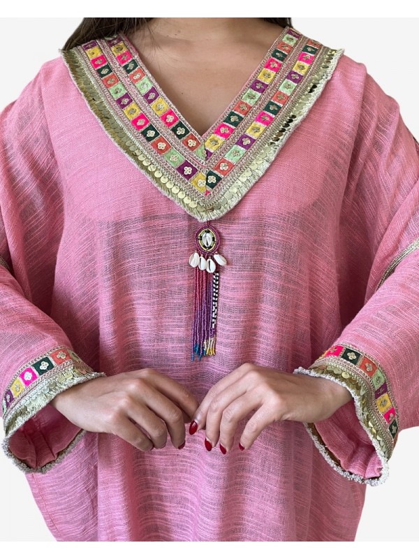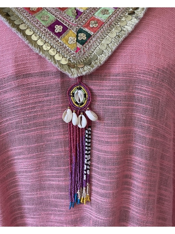 Jebba en tissu hakyek ornée de harj doré et coloré, agrémentée d’un pendentif suspendu en coris et rocaille, accompagnée d’un fond de robe assorti