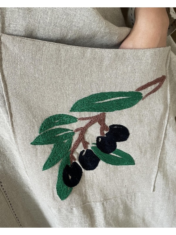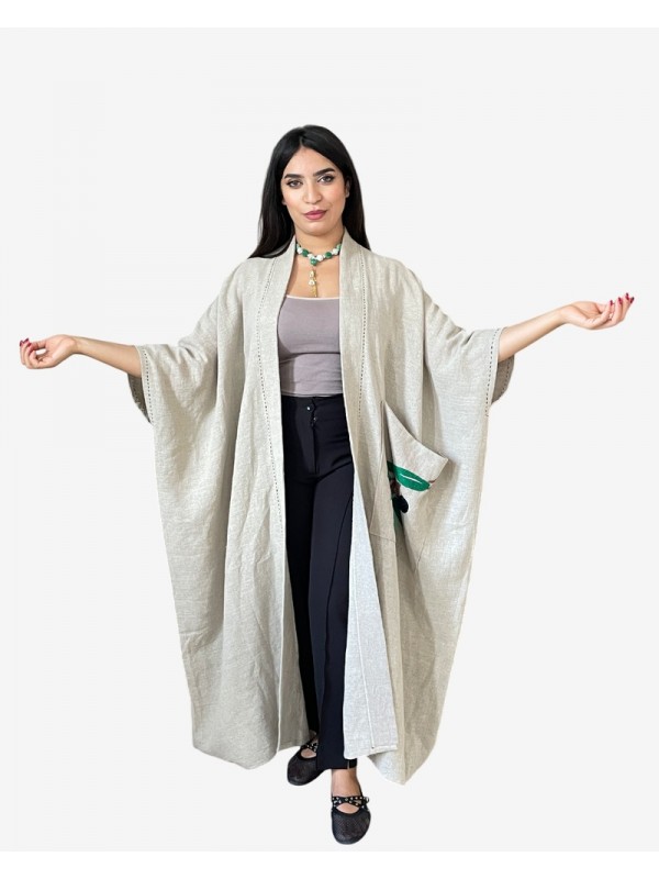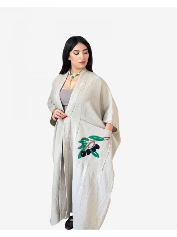 Abaya en lin grège, dotée d’une seule poche décorée d’une broderie de branche d’olive