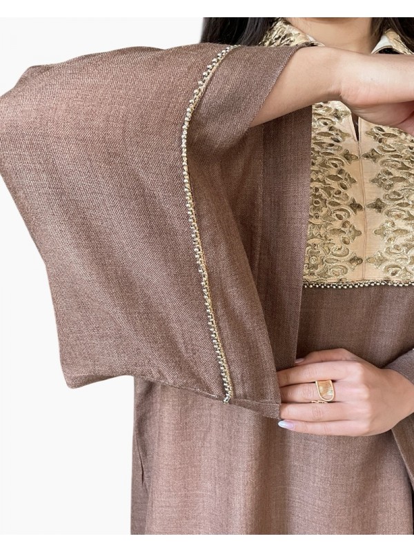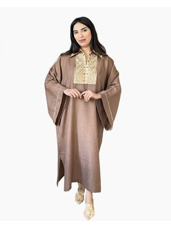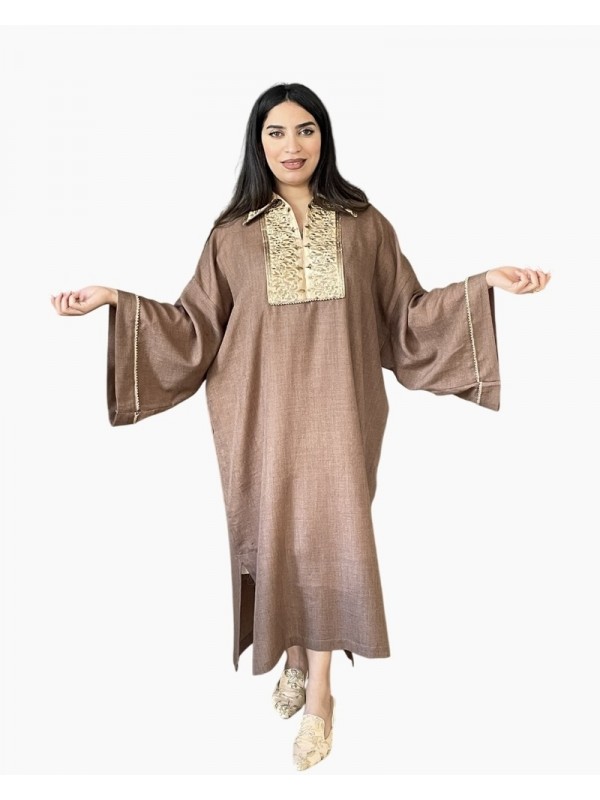 Jebba en tissu Hayek couleur marron glacé, sublimée par une broderie dorée raffinée au niveau de l’encolure. Les manches larges sont décorées de finitions délicates et de petits harej ornés de boules dorées.