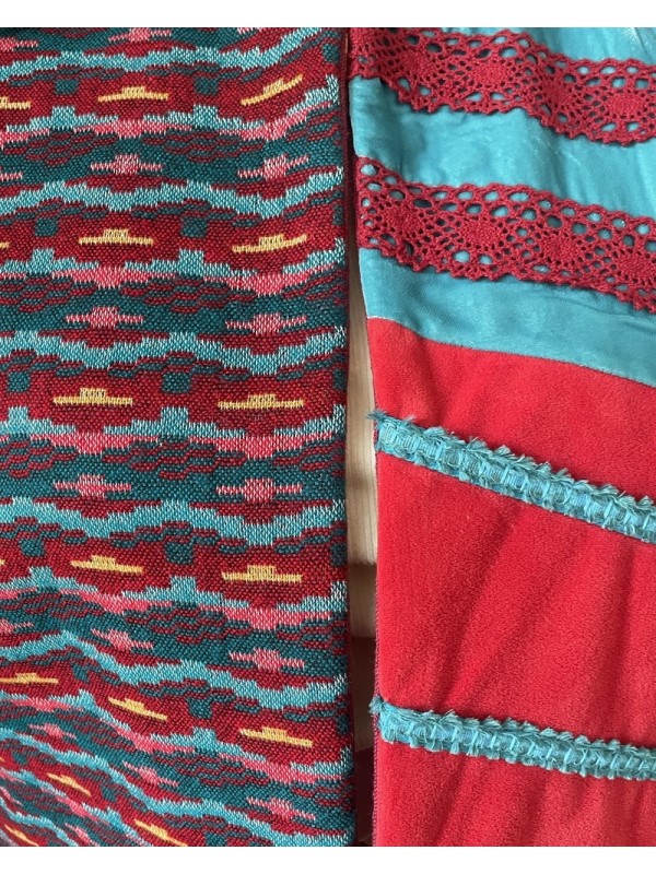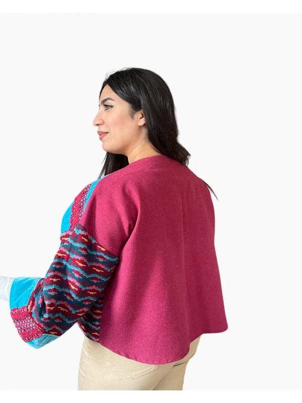 Veste courte Azura en patchwork aux nuances de turquoise et de rouge grenat