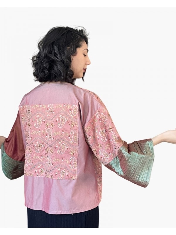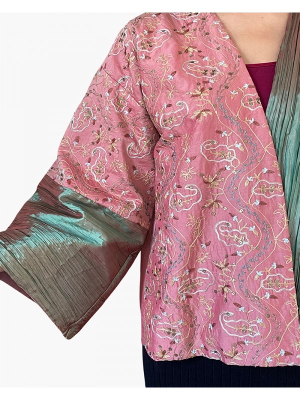 Veste artisanale bicolore rose poudré et terracotta, rehaussée de finitions vert d’eau. Broderies florales délicates et manches évasées pour une allure fluide