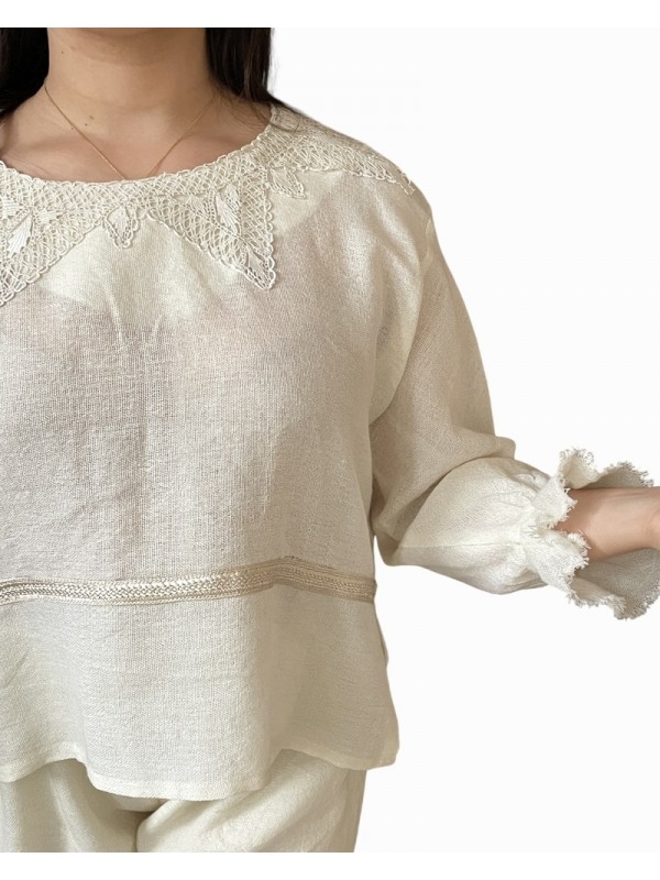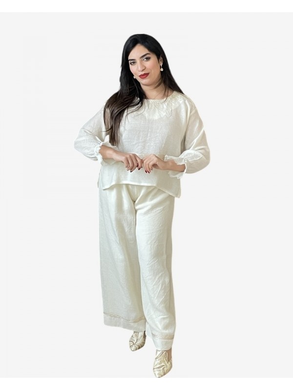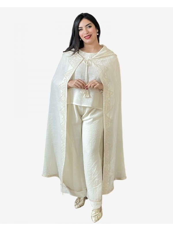 Ensemble Hayek écru brodé, comprenant pantalon, tunique et barnous. Confectionné avec soin, il met en valeur la finesse des broderies et l’élégance du tissu, idéal pour une tenue traditionnelle sophistiquée