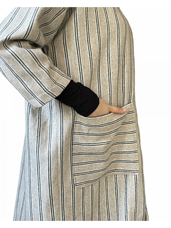 Veste kachabya à rayures verticales, accompagnée d’un cache-cou en laine grise.
