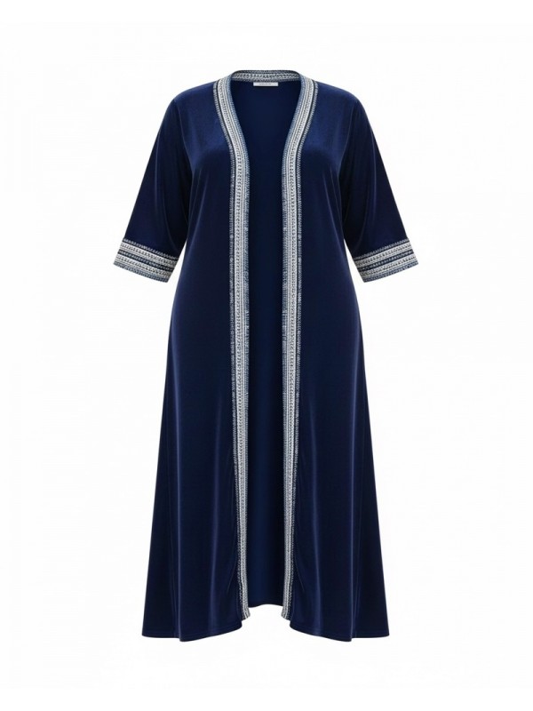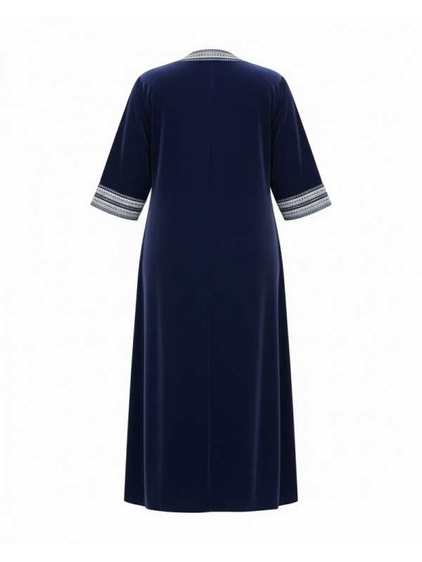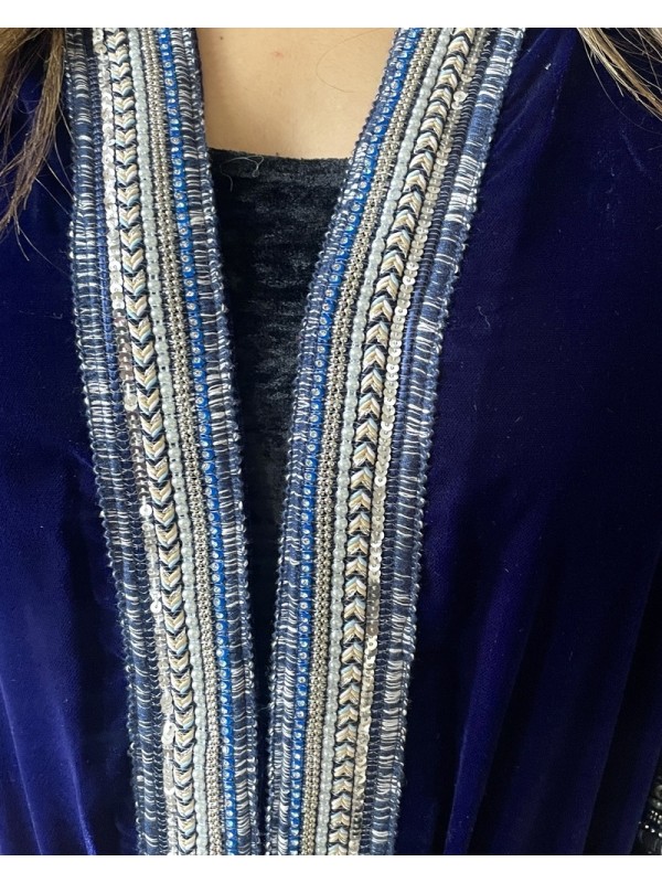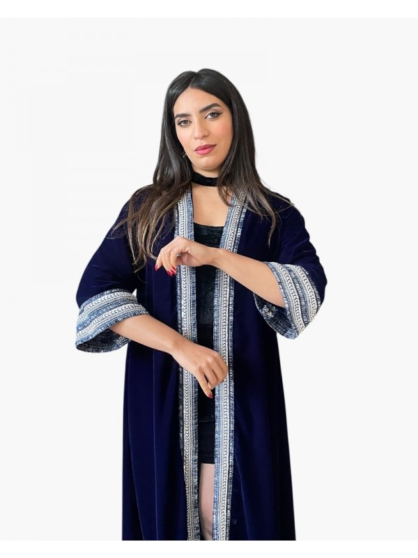 Abaya en velours de soie bleu marine, rehaussée d’un harej argenté