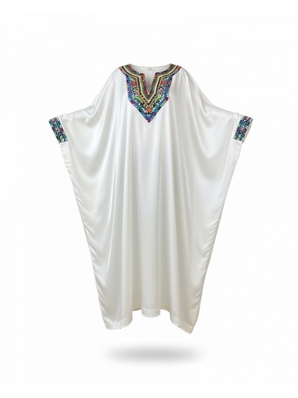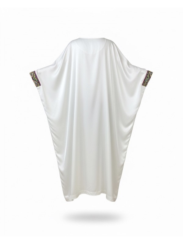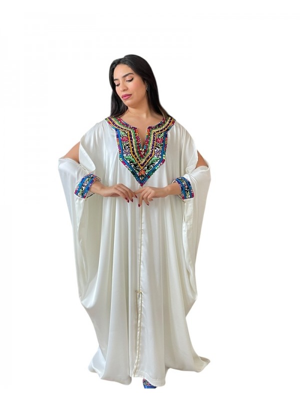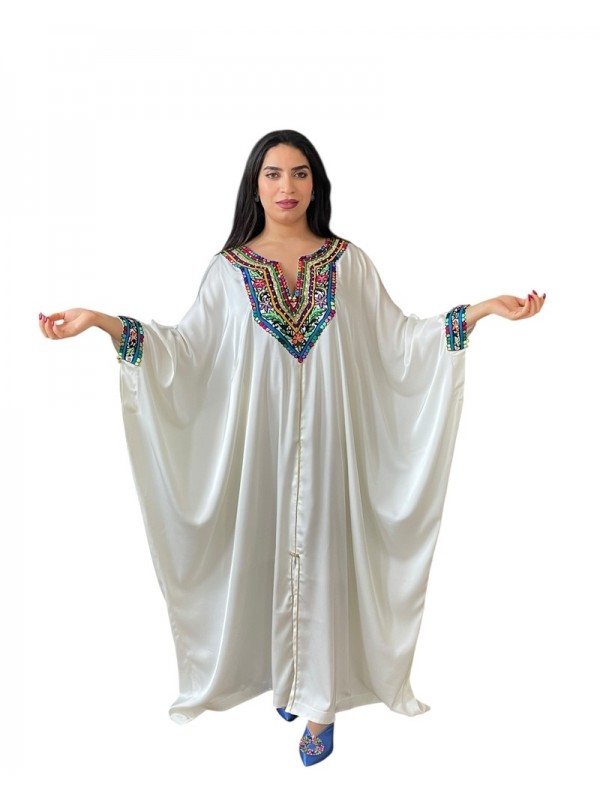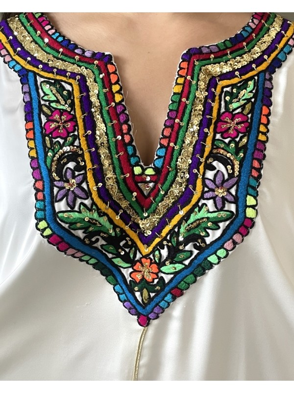 Jebba blanche en tissu fluide, ornée de harj avec broderie rafraf colorée