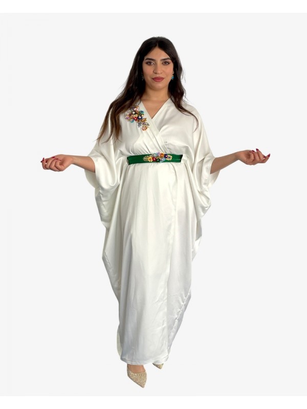Kimono croisé en tissu satiné, à la coupe fluide. Orné de broderies en rocaille colorée près du col et accompagné d’une ceinture verte brodée