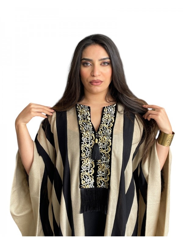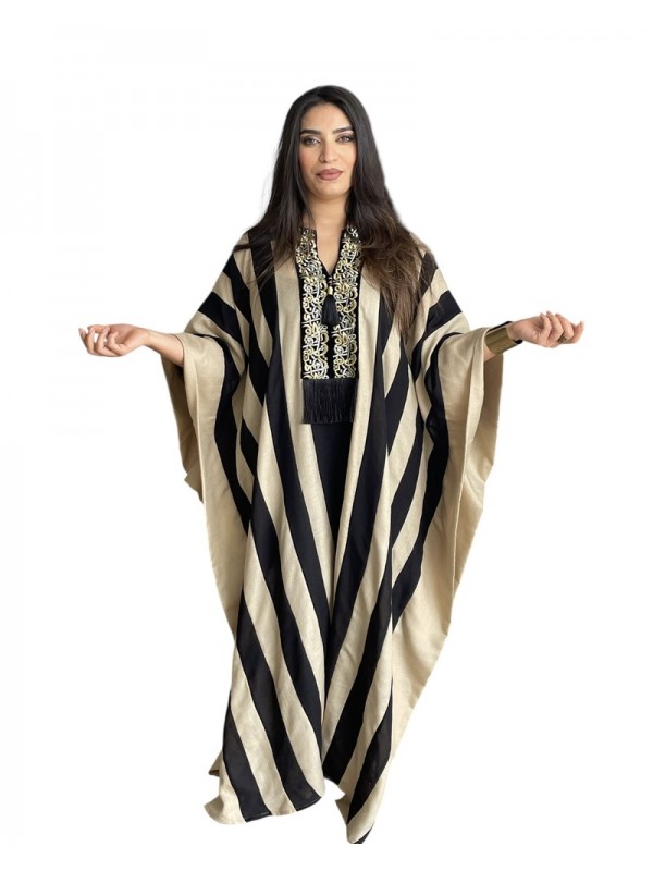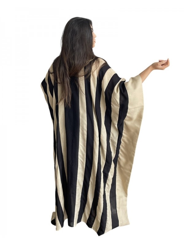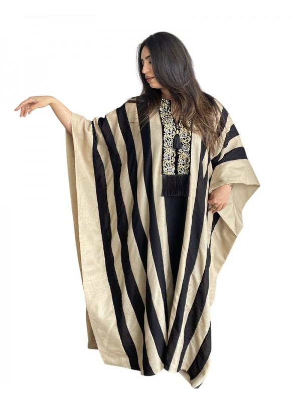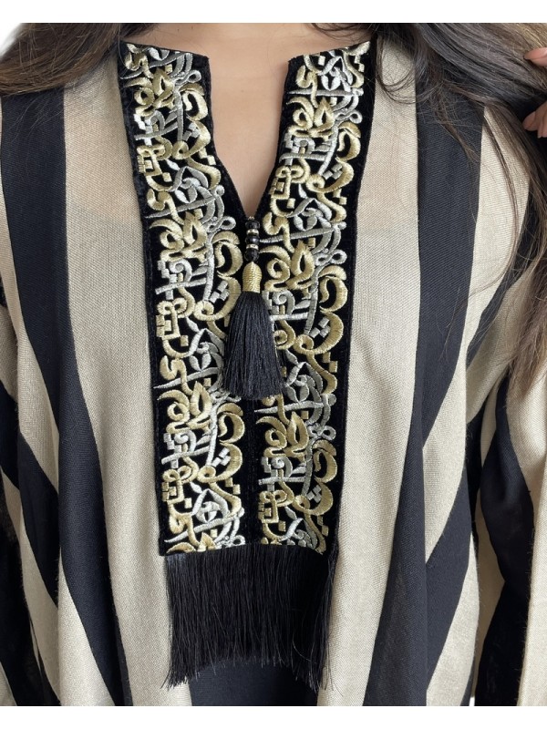 Jebba rayée noire et grège, modèle papillon à la coupe ample et fluide, ornée à l’avant de broderie calligraphique et de franges noires