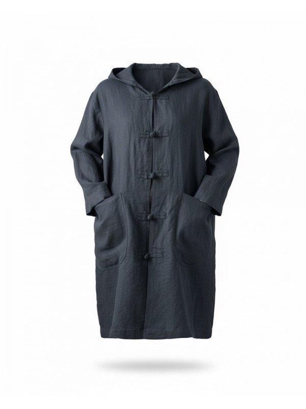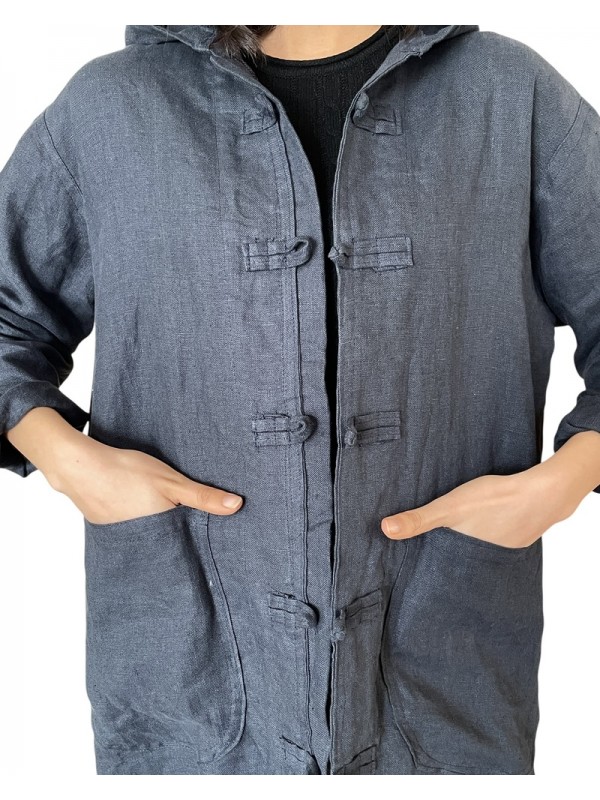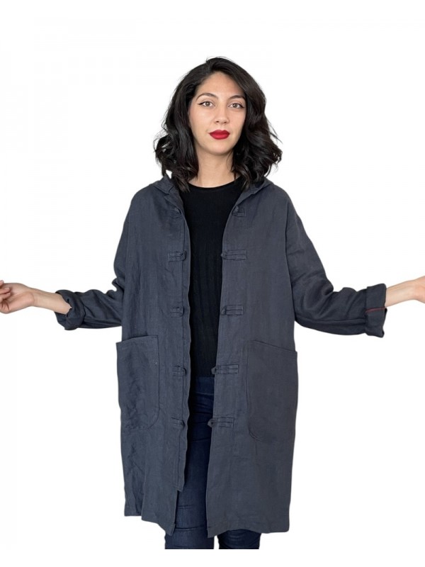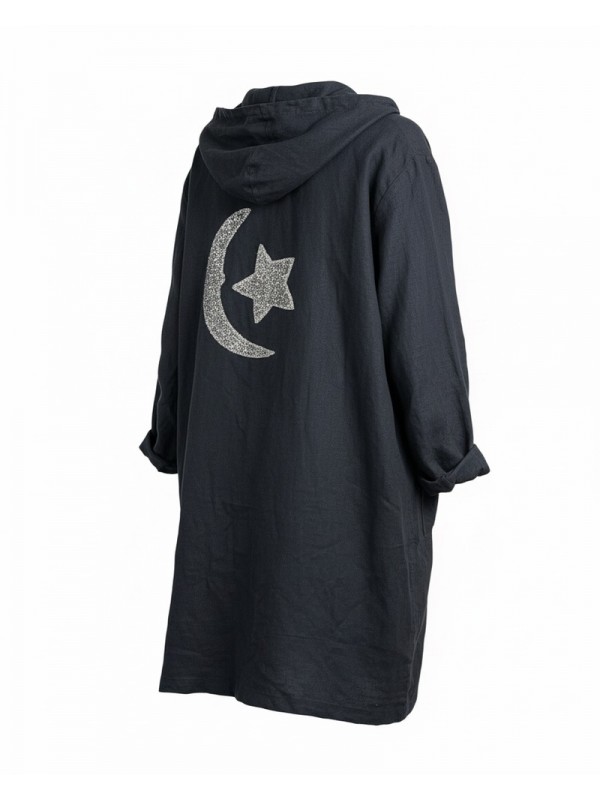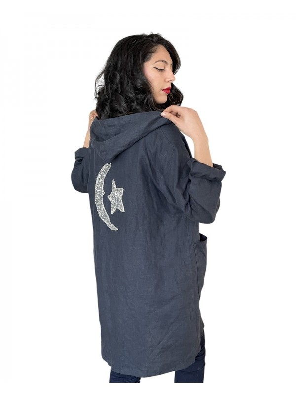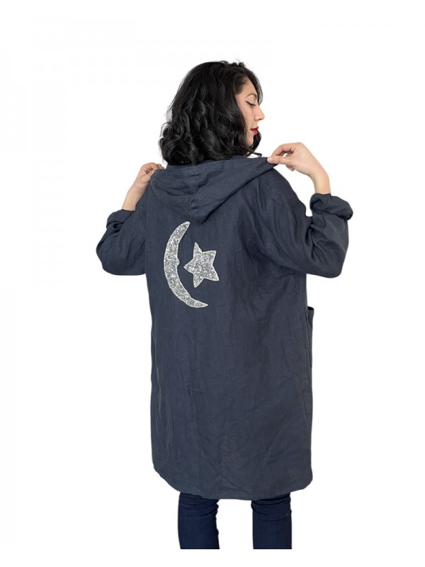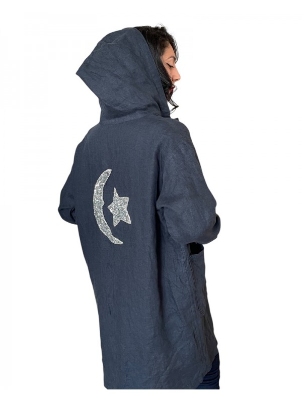 Dengris bleu marine avec capuche, motif lune et étoile brodé au dos, et deux poches pratiques.
