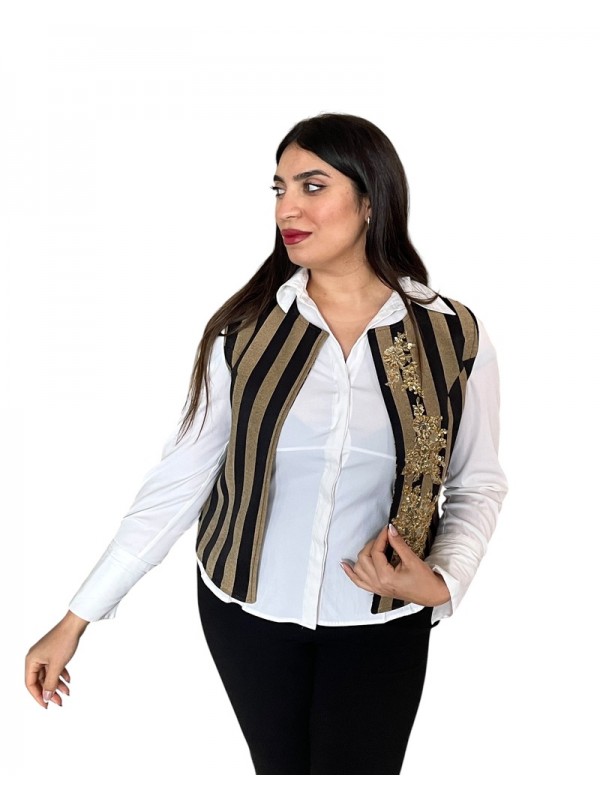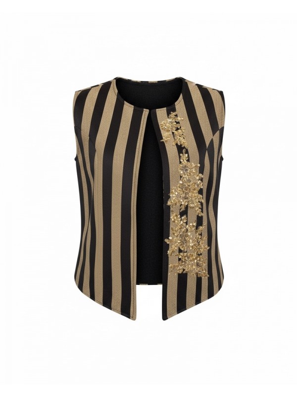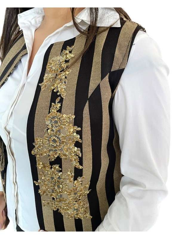 Farmla en brocart noir et beige, brodée de rocaille, avec un dos à motif floral. Une pièce artisanale authentique
