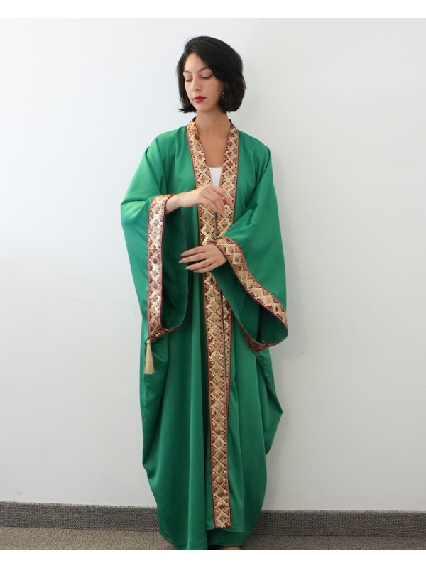 Abaya en satin vert crêpe Oslo , Des manches pagode ornée d un galon brodé en rocaille doré et rouge