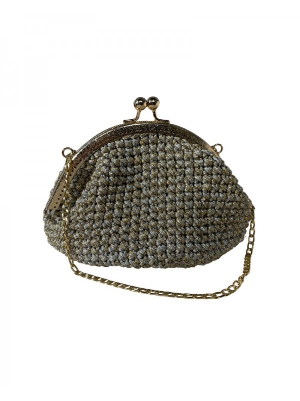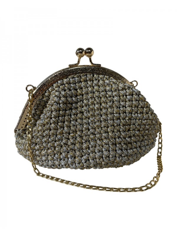 Pochette en macramé beige , rehaussée de fils dorés, avec texture lumineuse, fermoir métallique rétro et chaîne dorée