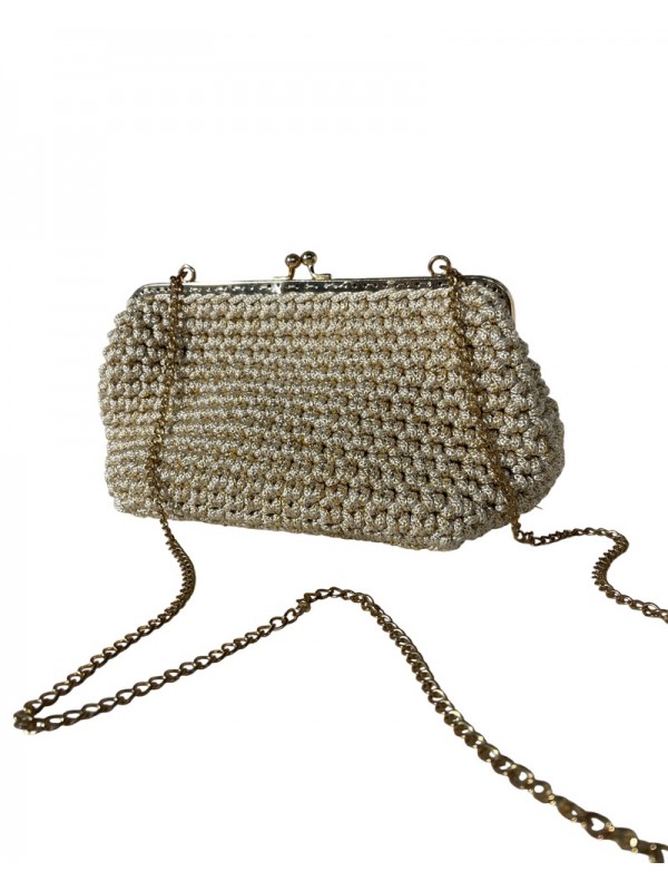 Pochette en macramé écru, rehaussée de fils dorés, avec texture lumineuse, fermoir métallique rétro et chaîne dorée