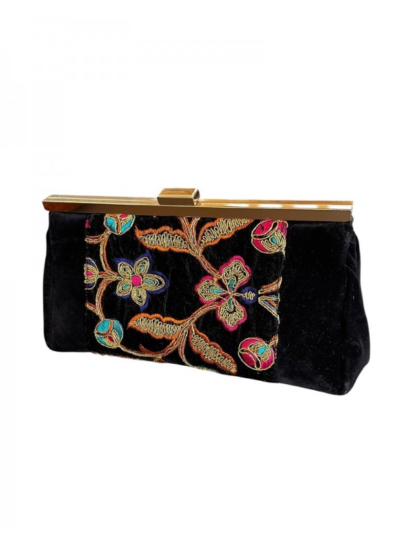 Pochette en velours noir ornée de broderies florales, fermoir doré