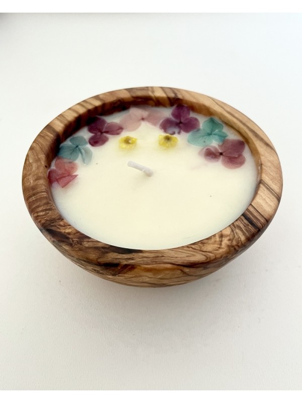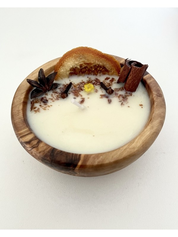 Bougie parfumée dans une pièce en bois naturel, décorée d’épices et d’écorces, pour une ambiance chaleureuse